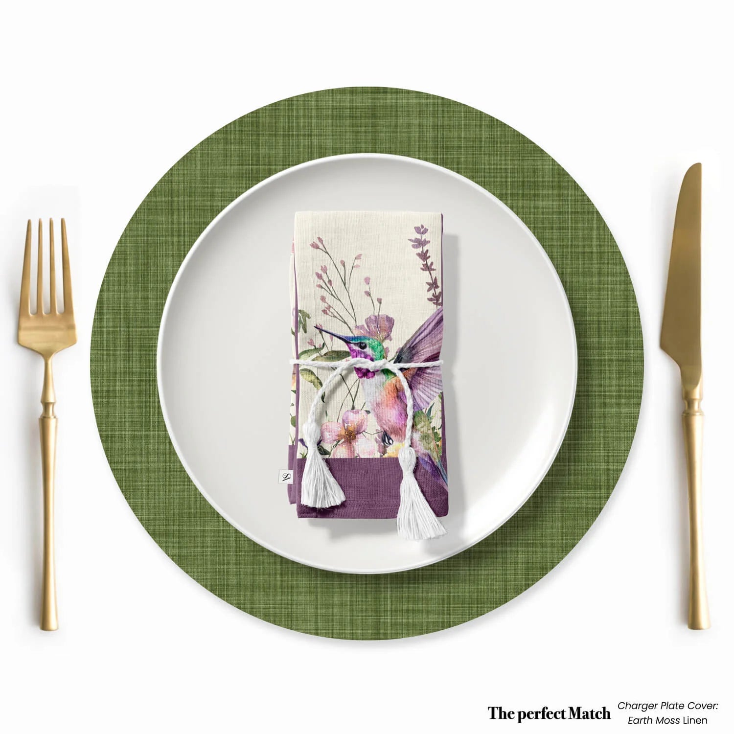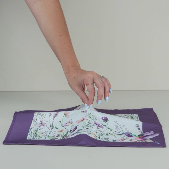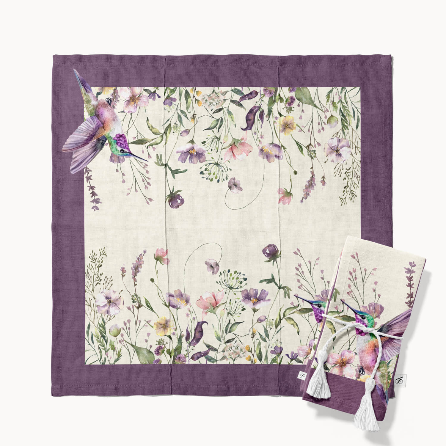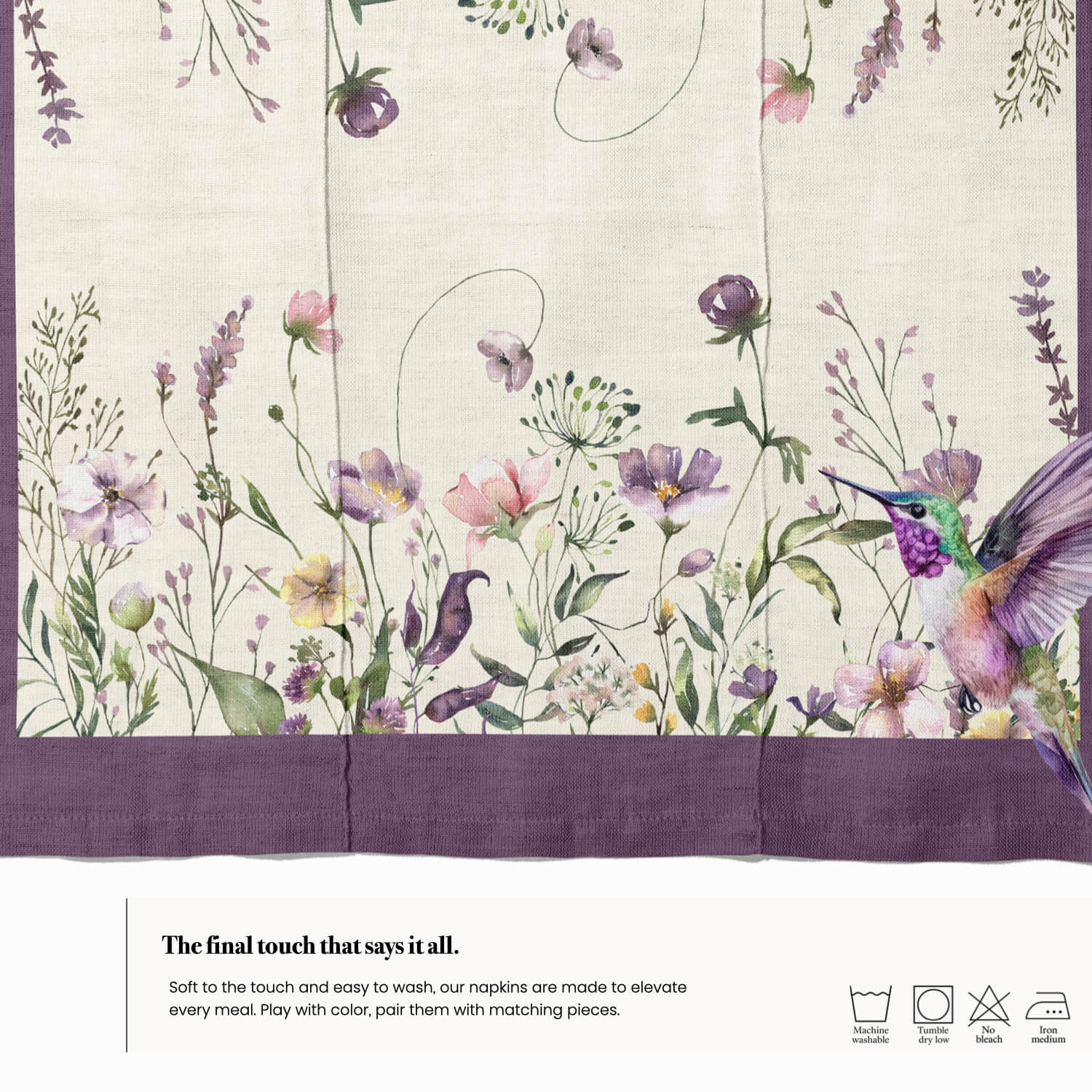 Step into a moment of quiet wonder with our Secret Garden Napkin. Watercolor blossoms in soft purples, pinks, and yellows bloom alongside hummingbirds and wildflowers on a creamy backdrop. A rich plum border frames the airy floral design, adding elegance and balance to this delicate, nature inspired piece.