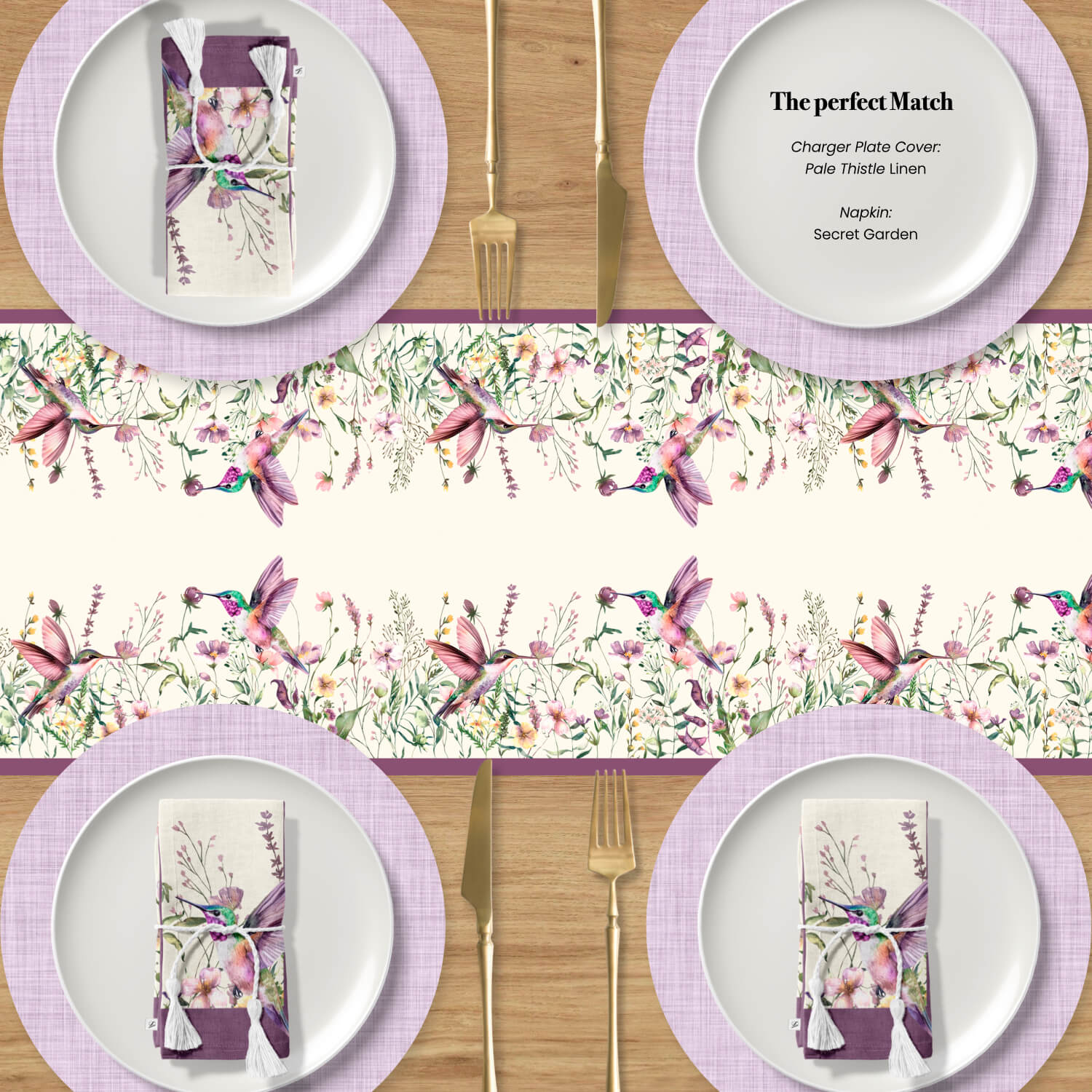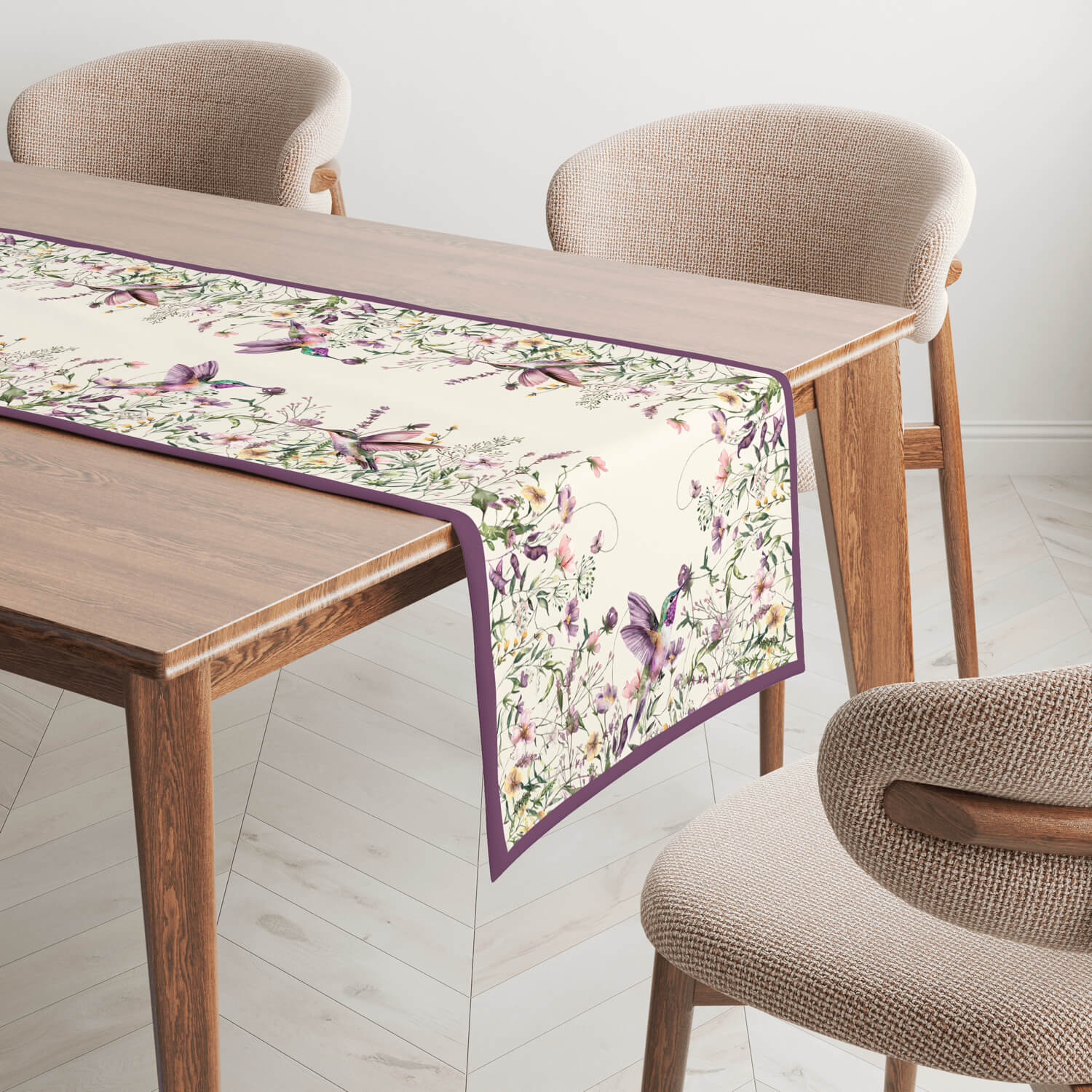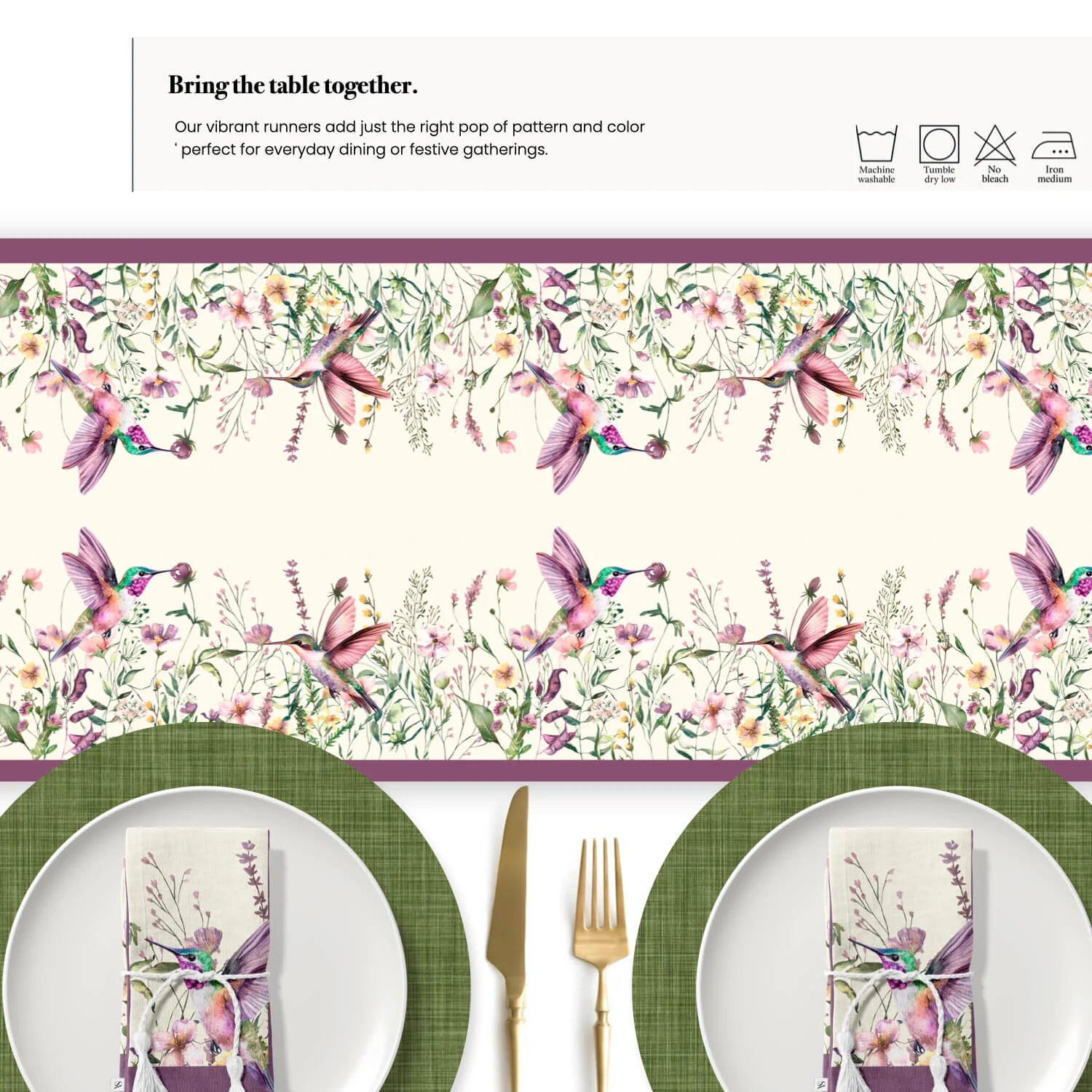 Add a magical touch to your table with our Secret Garden Table Runner. Vibrant hummingbirds flutter among wildflowers in soft pinks, lilacs, and greens, set against an ivory backdrop. A deep plum border frames the design with richness and contrast whimsical, fresh, and full of life for any occasion.