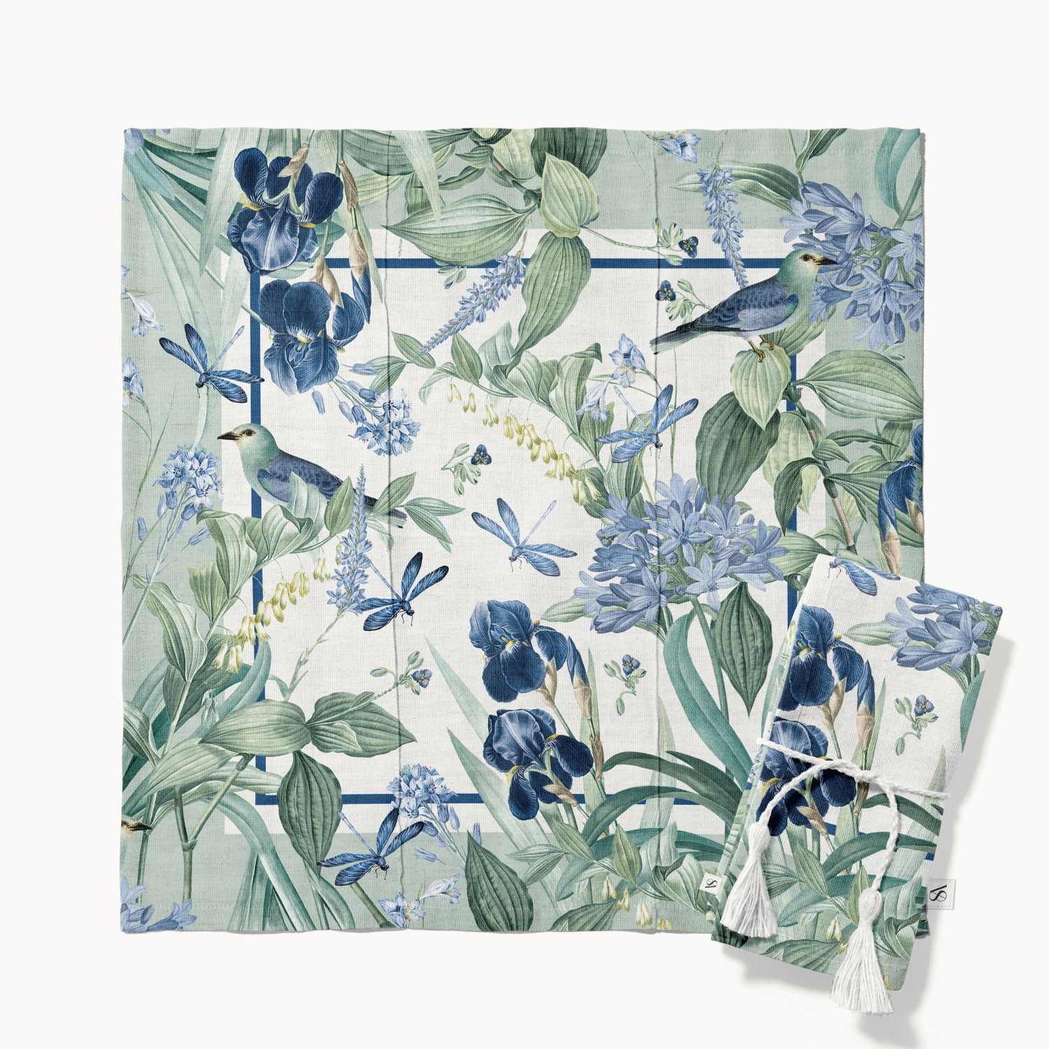 Fresh and delicate. Our Mint Blossom Napkin features watercolor florals in soft blues and greens, accented with graceful birds and dragonflies over a mint-toned backdrop. Handmade in Guatemala from easy-care fabric, it brings a serene, nature-inspired touch of elegance and charm to everyday meals and special gatherings.